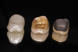 Crowns are synthetic caps, usually made of a material like porcelain, placed on the top of a tooth.