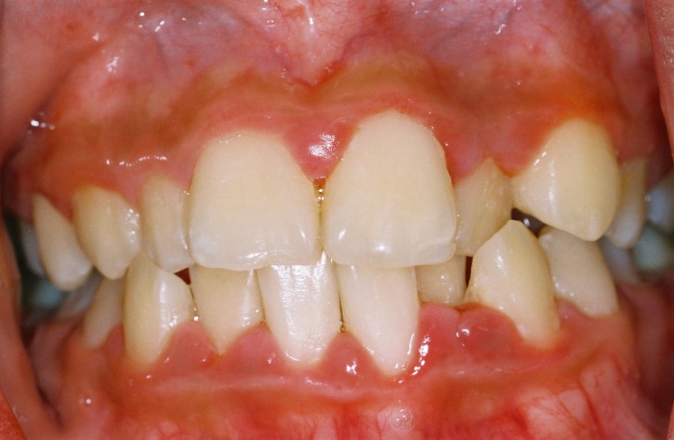 A patient with generalised gingivitis. Note the red, swollen, inflammed gum tissues around the teeth. These gums bleed easily on brushing.