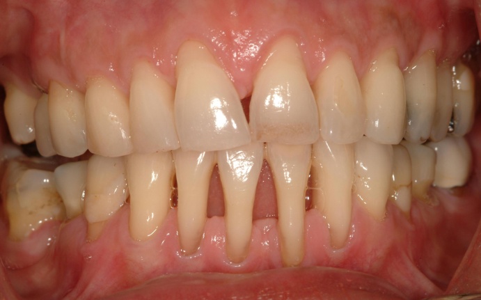 Patient with advanced periodontitis showing severe loss of bone and gum recession.