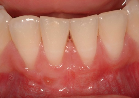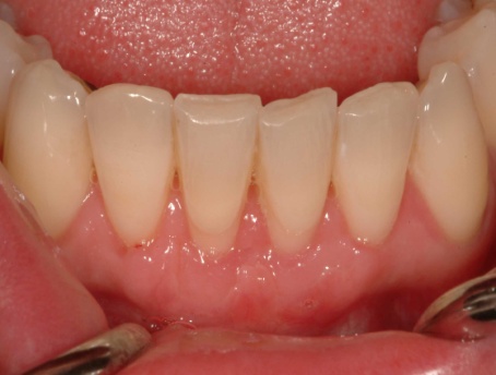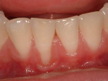 Lower incisor tooth with recession. A gum graft was used to repair this recession.